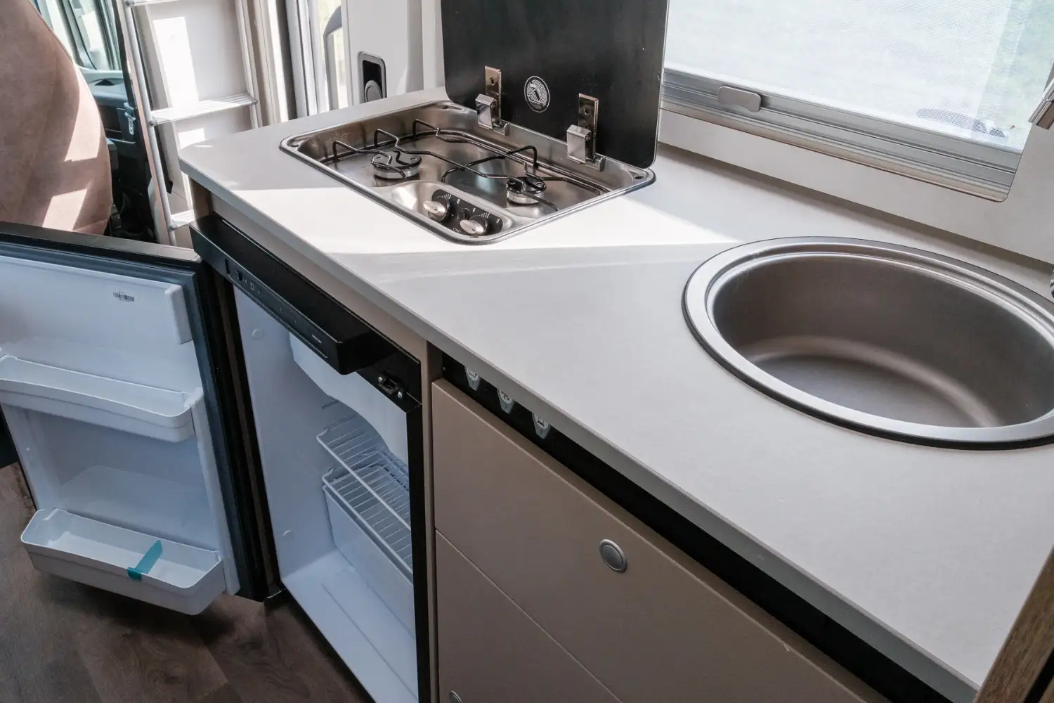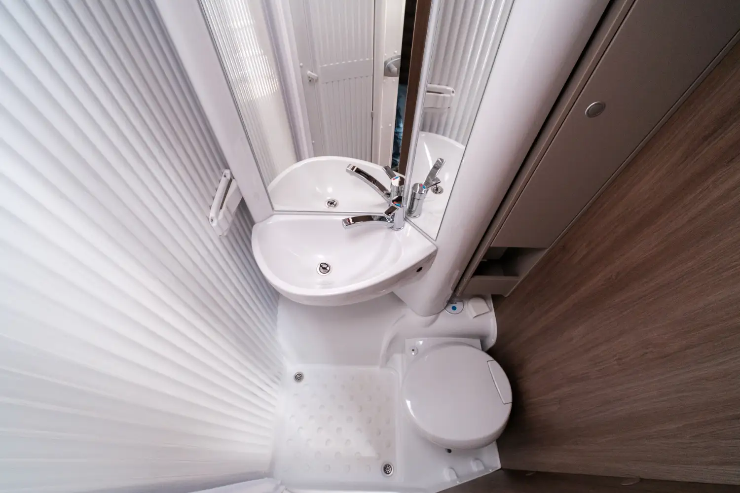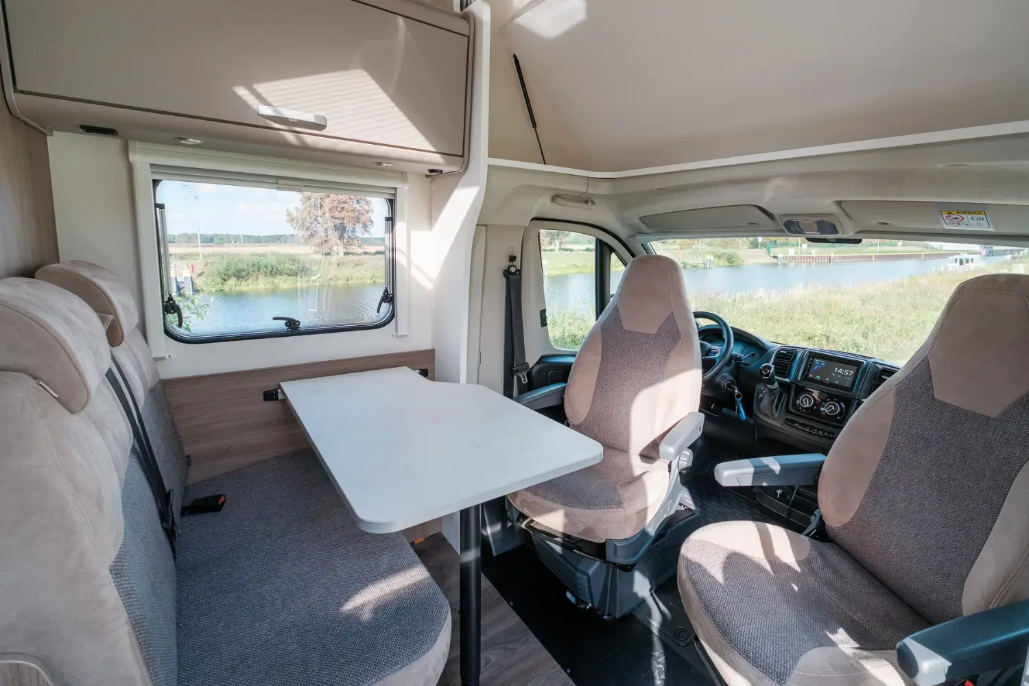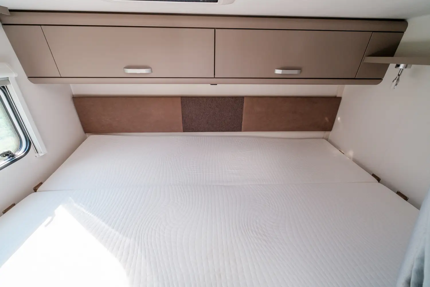 Dieses exklusive Wohnmobil lässt auf 6 Meter Außenlänge keine Wünsche offen. Im Heck befindet sich ein Doppelbett, für zwei weitere Reisende bietet der großzügige Alkoven Platz zum Ruhen.