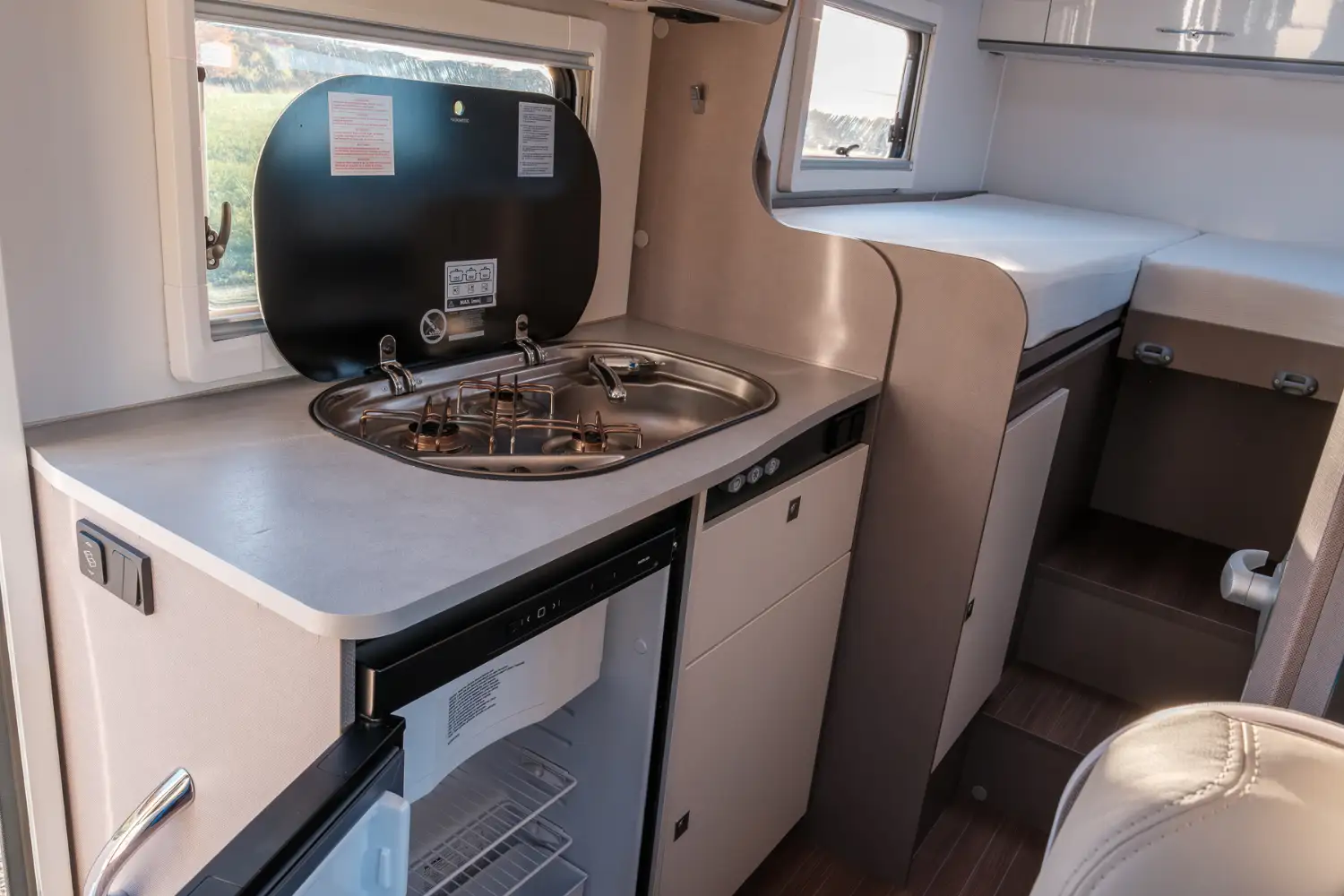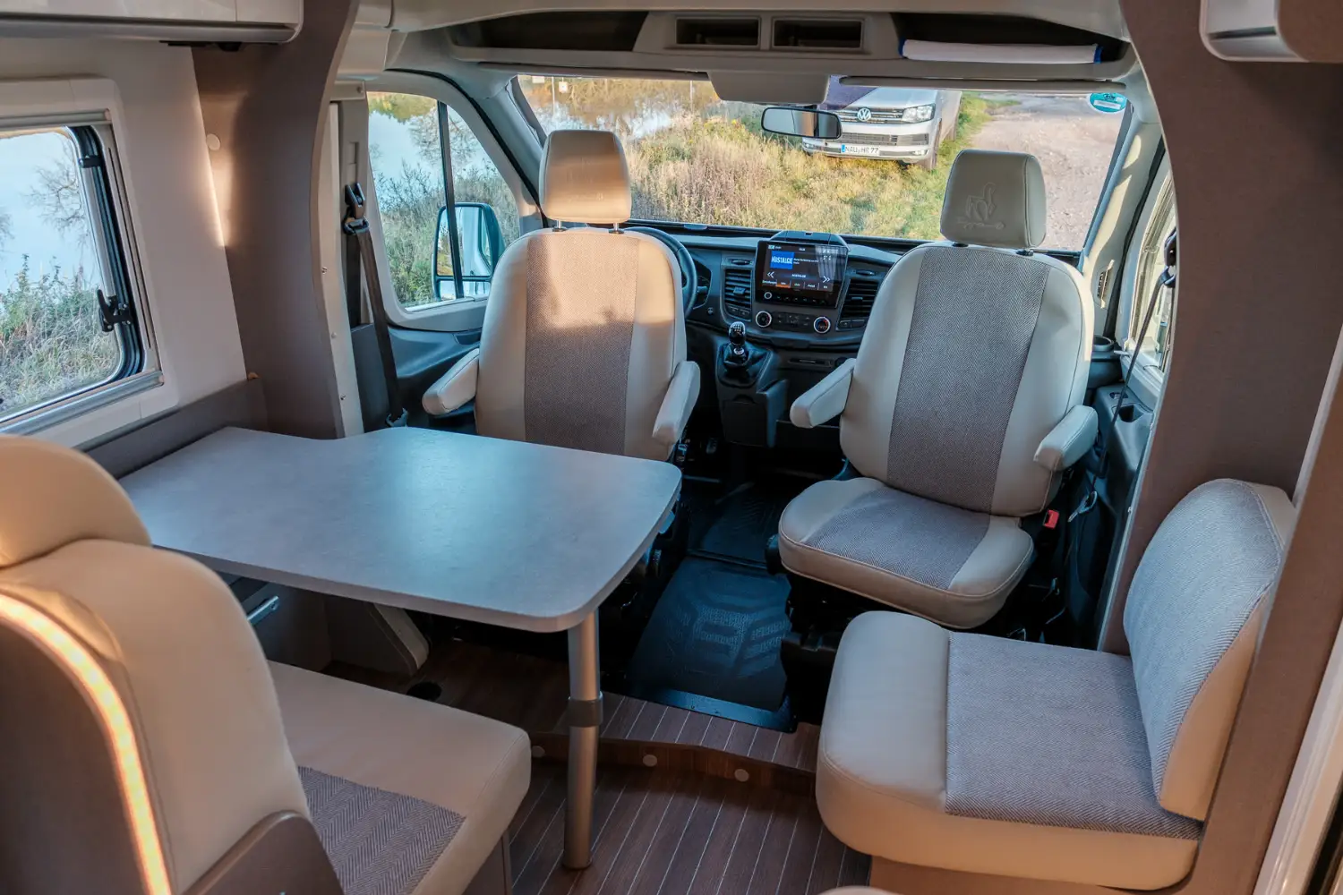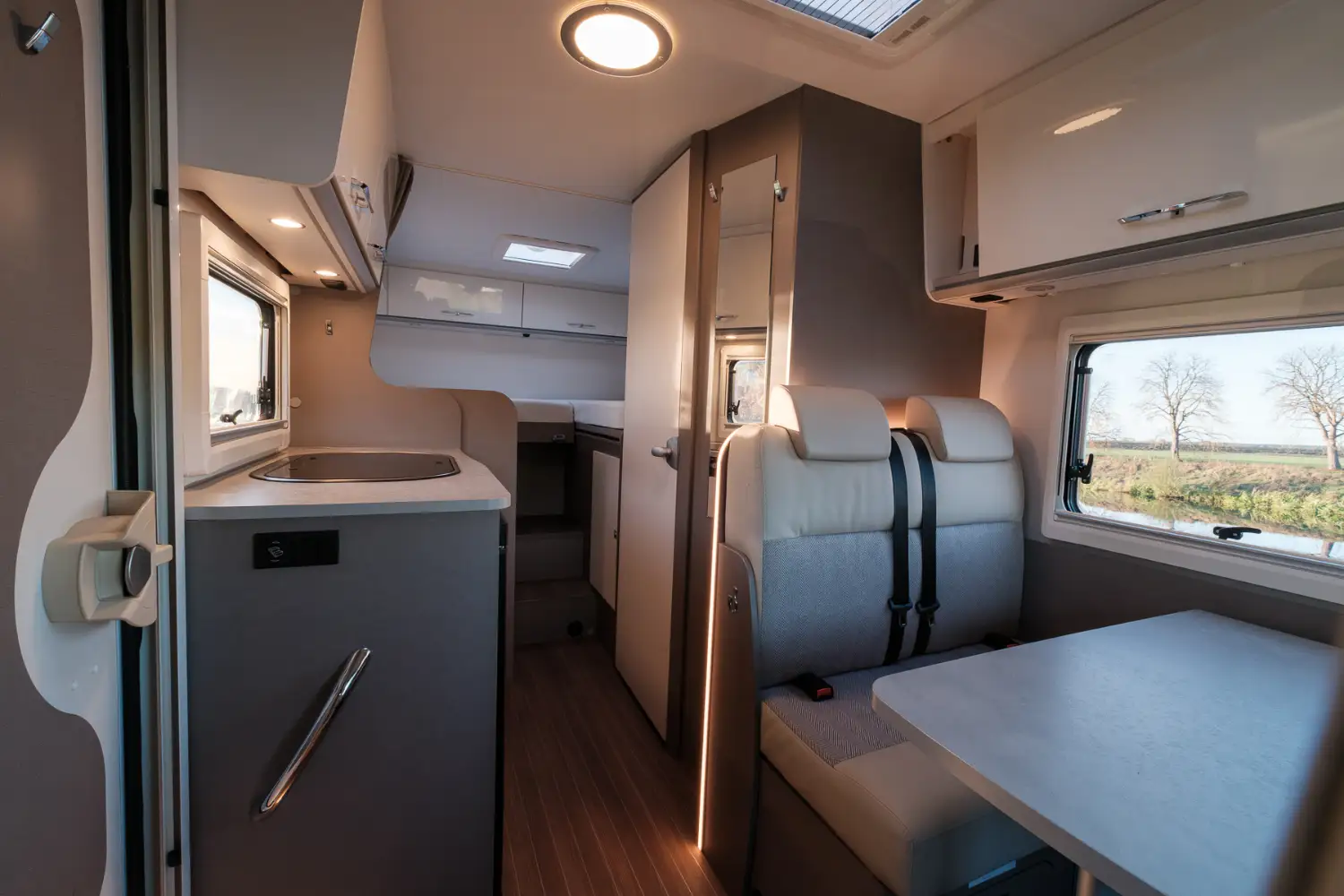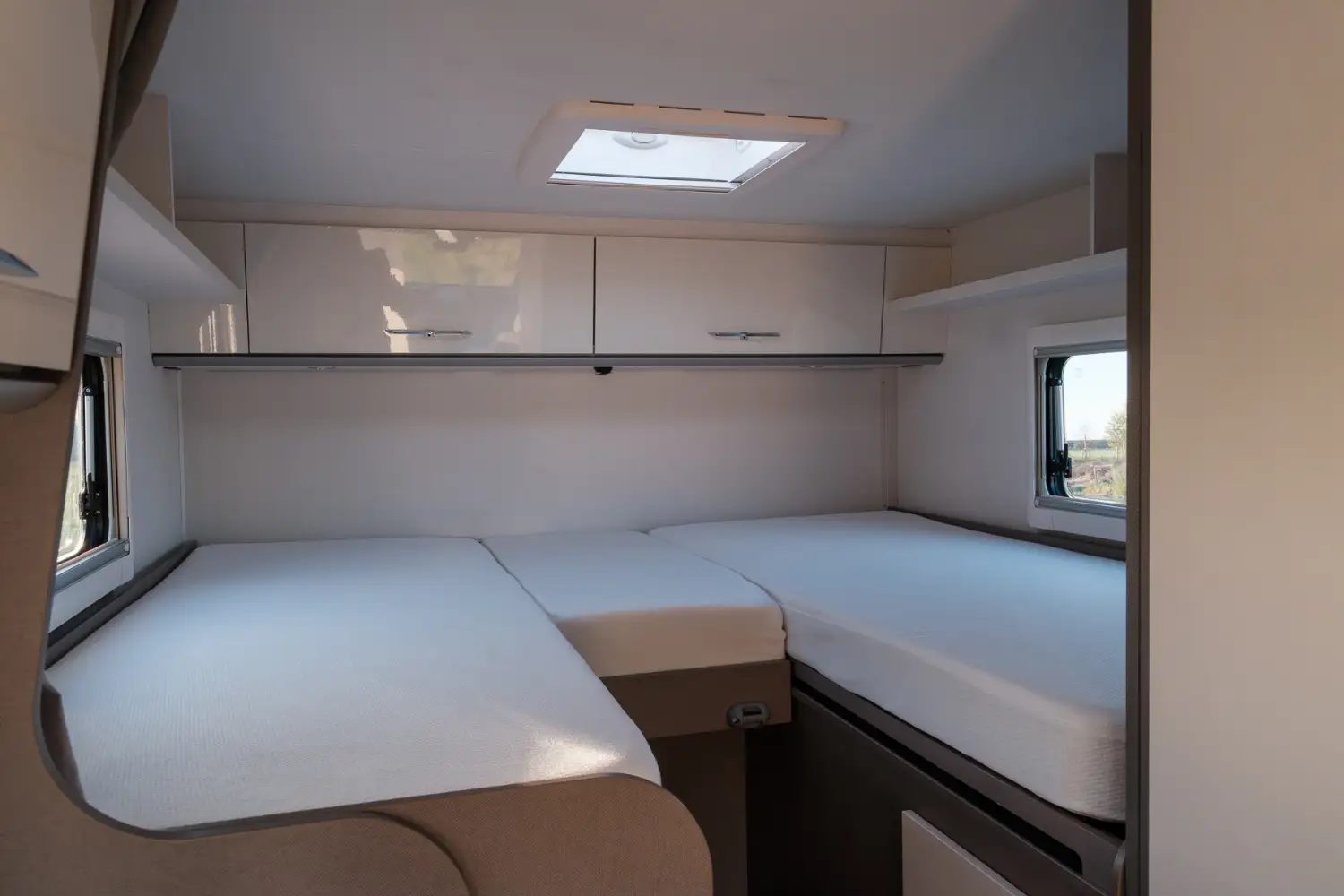 Die bequemen Einzelbetten im Heck lassen sich zu einem großen Schlafbereich erweitern und Reiseutensilien können in den geräumigen Schränken über und neben dem Bett verstaut werden. Der moderne Wohnbereich im für Etrusco typischen Bicolor-Design verleiht dem Fahrzeuginnenraum einen besonderen Charme. Das funktionale Bad, die große Heckgarage und die praktische Küchenzeile runden den T 6.6 SF ab.