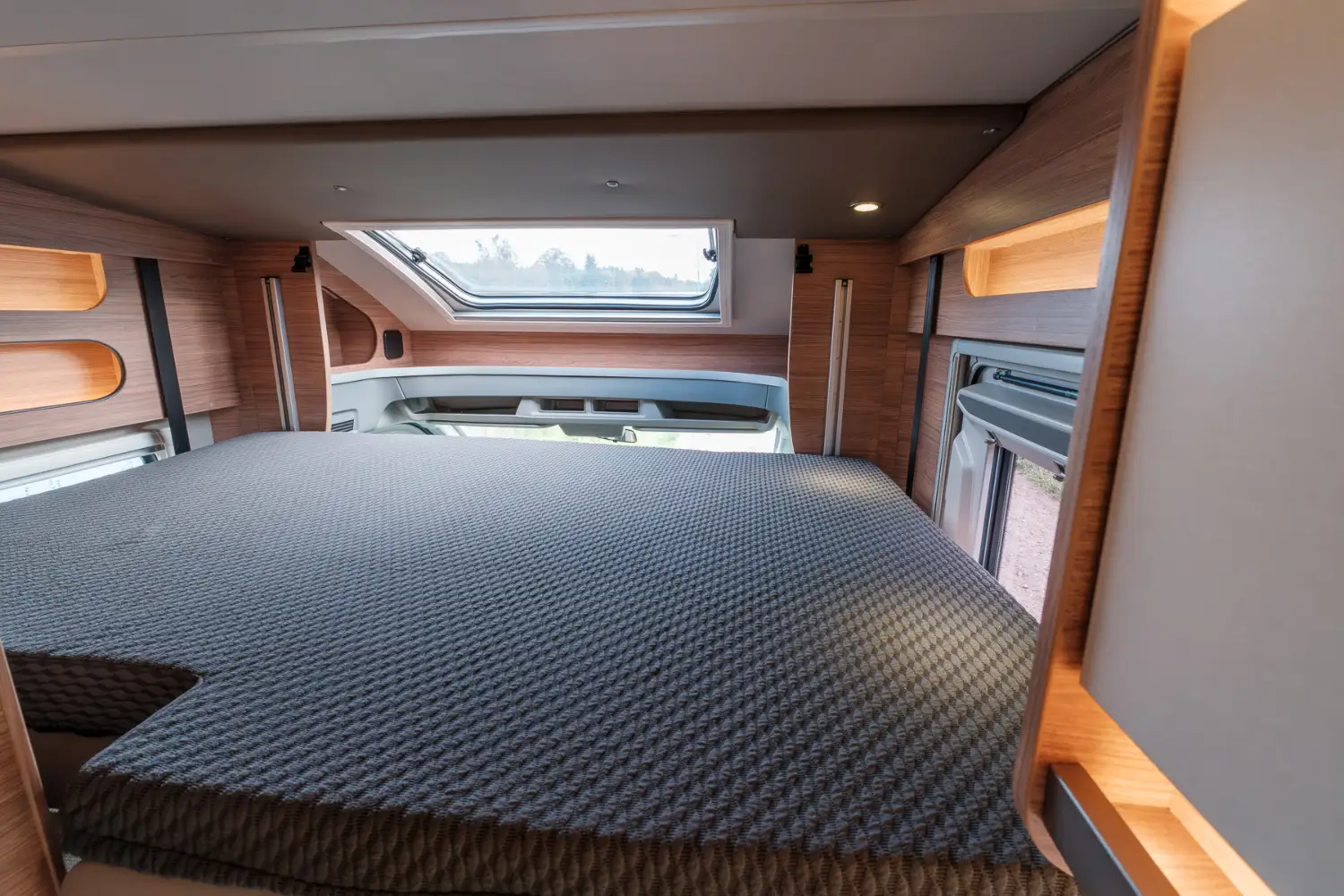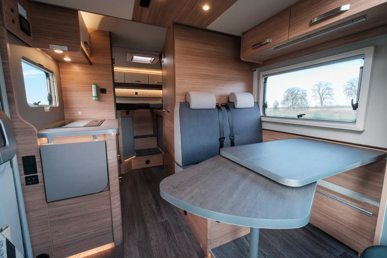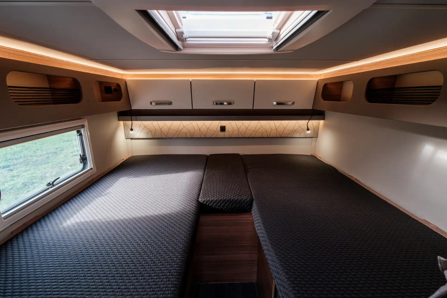 Dank der großzügigen Stehhöhe und des durchdachten Interior Designs fühlen Sie sich wie Zuhause. Praktische Verstaumöglichkeiten sorgen für Ordnung und die hochwertige Linienführung schafft eine angenehme Atmosphäre. Das Raumwunder: Das Hubbett lässt sich tagsüber problemlos verstauen, sodass der darunterliegende Raum optimal genutzt werden kann. Genießen Sie großzügigen Stauraum, während intelligente Assistenzsysteme für Ihre Sicherheit sorgen. Der 133 Liter Kühlschrank mit automatischer Energieauswahl ist äußerst praktisch und effizient.